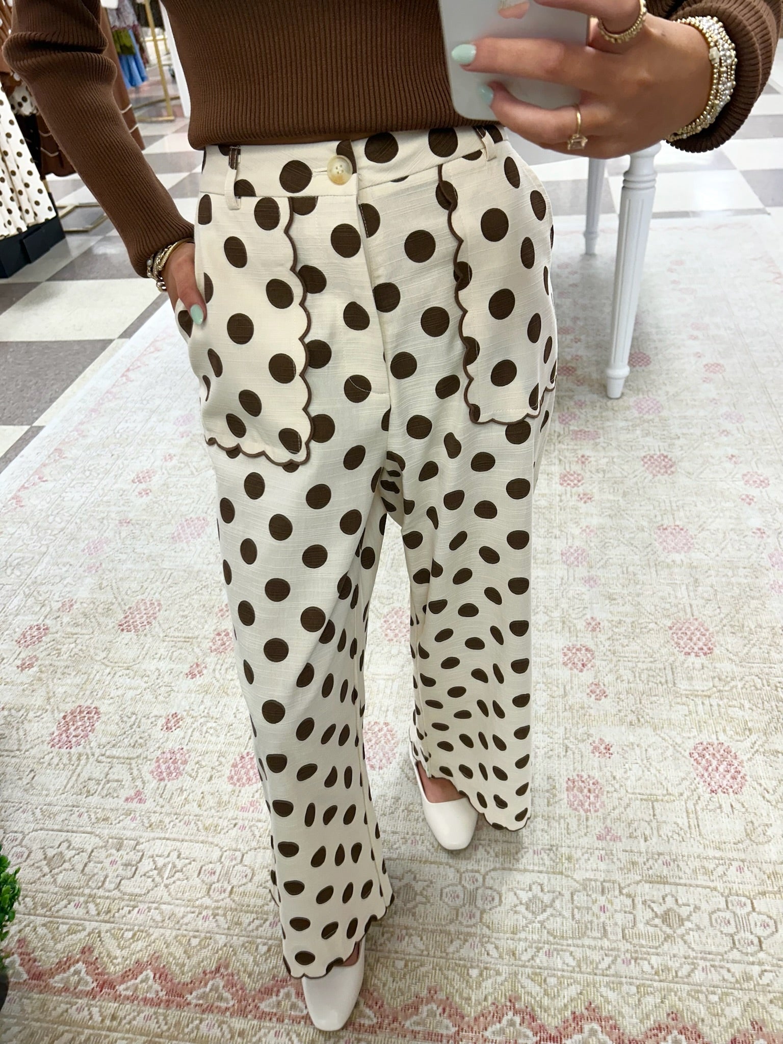 Classic with a playful twist, these wide leg pants feature brown polka dots and scallop detailing along the pocket edges and leg hems. Crafted from breathable cotton for an effortless blend of comfort and style.
