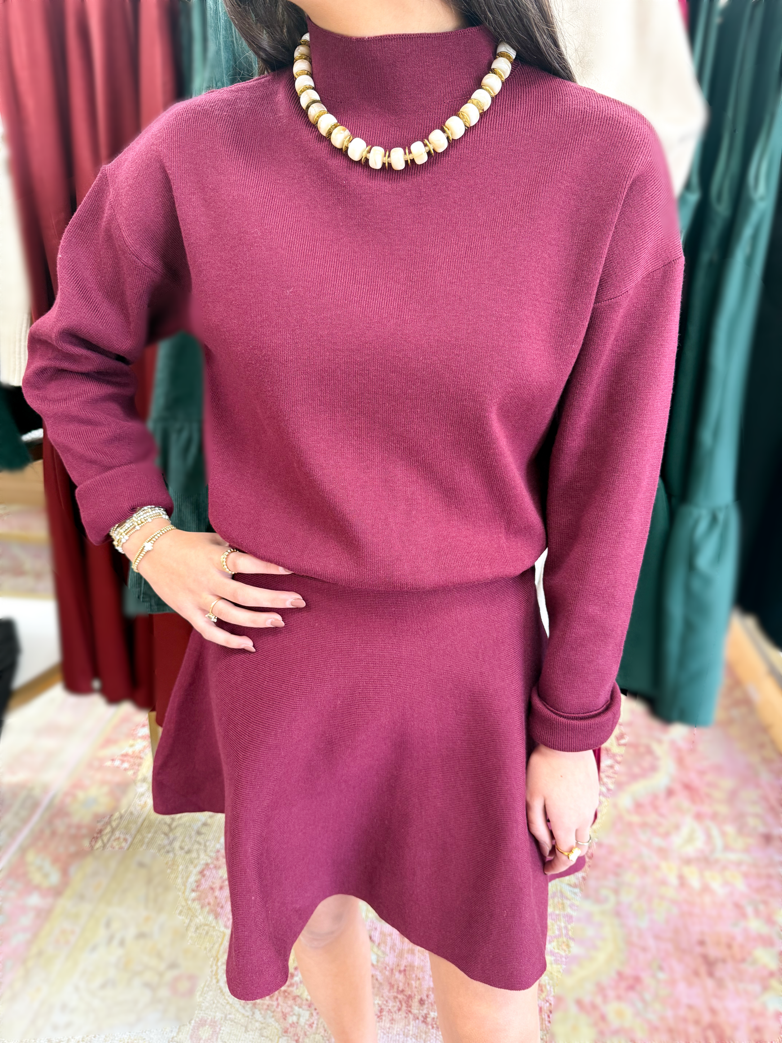 This burgundy sweater dress features a soft knit feel with long sleeves and a relaxed fit. Designed with a comfortable elastic waist and a flowy skirt for easy movement, it’s perfect for dressing up or keeping it casual. An effortless go-to for fall and winter days.