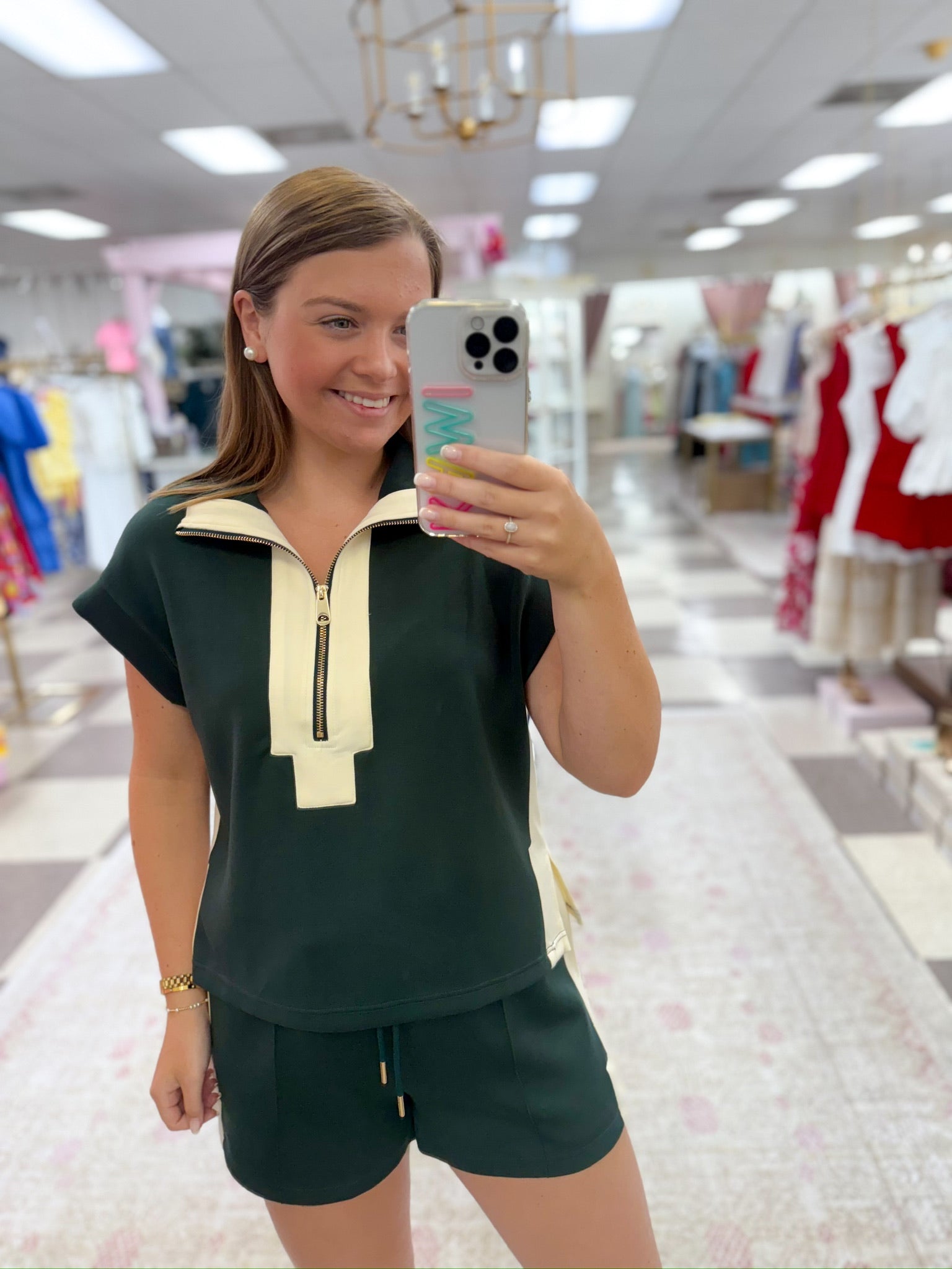 Sporty meets chic in the Camden Set. Featuring a zip-front short sleeve top with contrast trim and matching drawstring shorts (available in this gorgeous green color), this set is comfy, cool, and made for on-the-go days. Style it with sneakers or slides for the perfect casual look.
