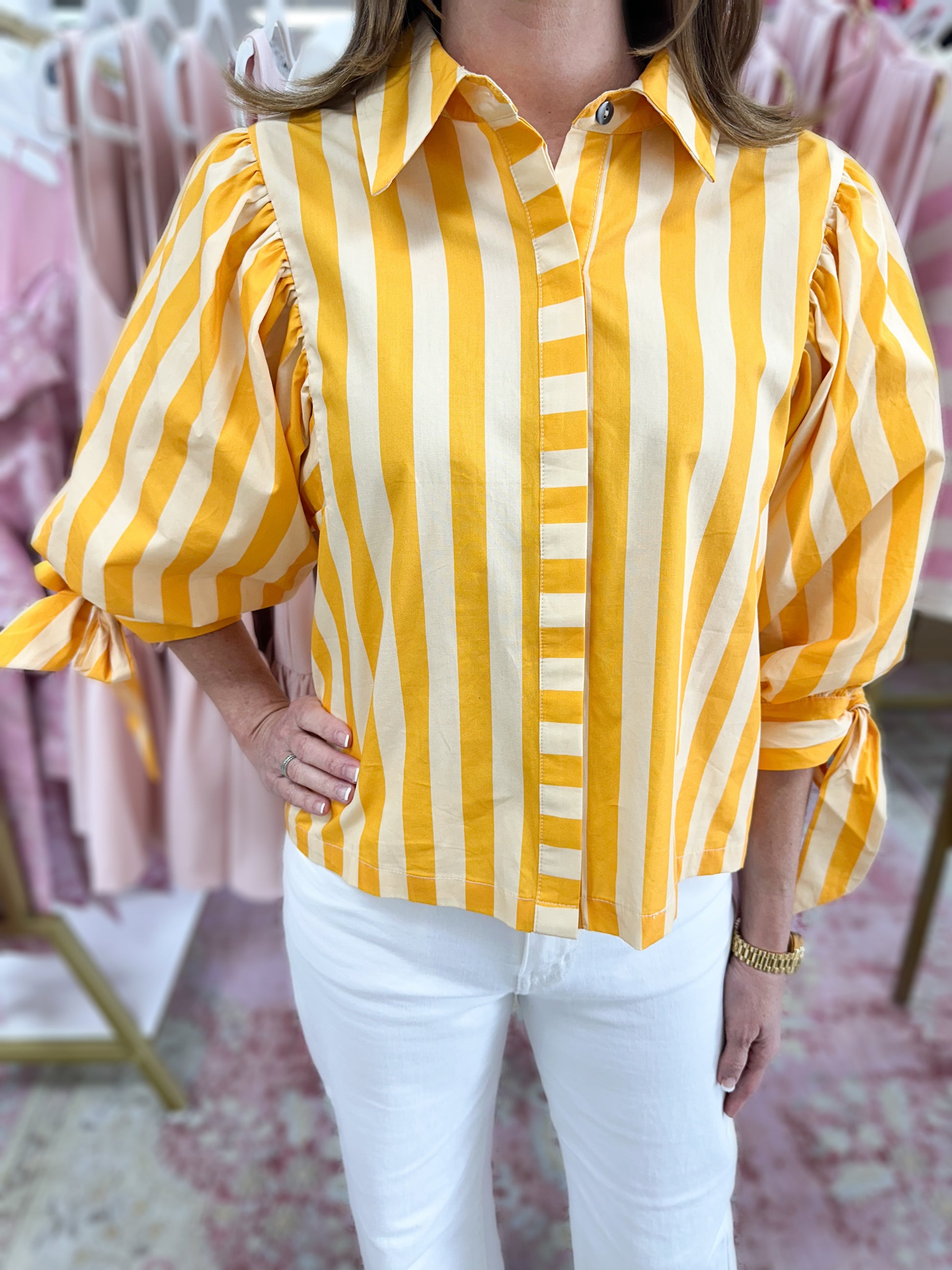 The Catherine Striped Top is a charming blend of classic tailoring and feminine detail. Designed with a crisp collar and button-up front, this three-quarter sleeve top features gold striped detailing and sweet bow ties at the ends of the sleeves for a playful finish. Lightweight and breathable, it’s an easy piece to dress up or down.