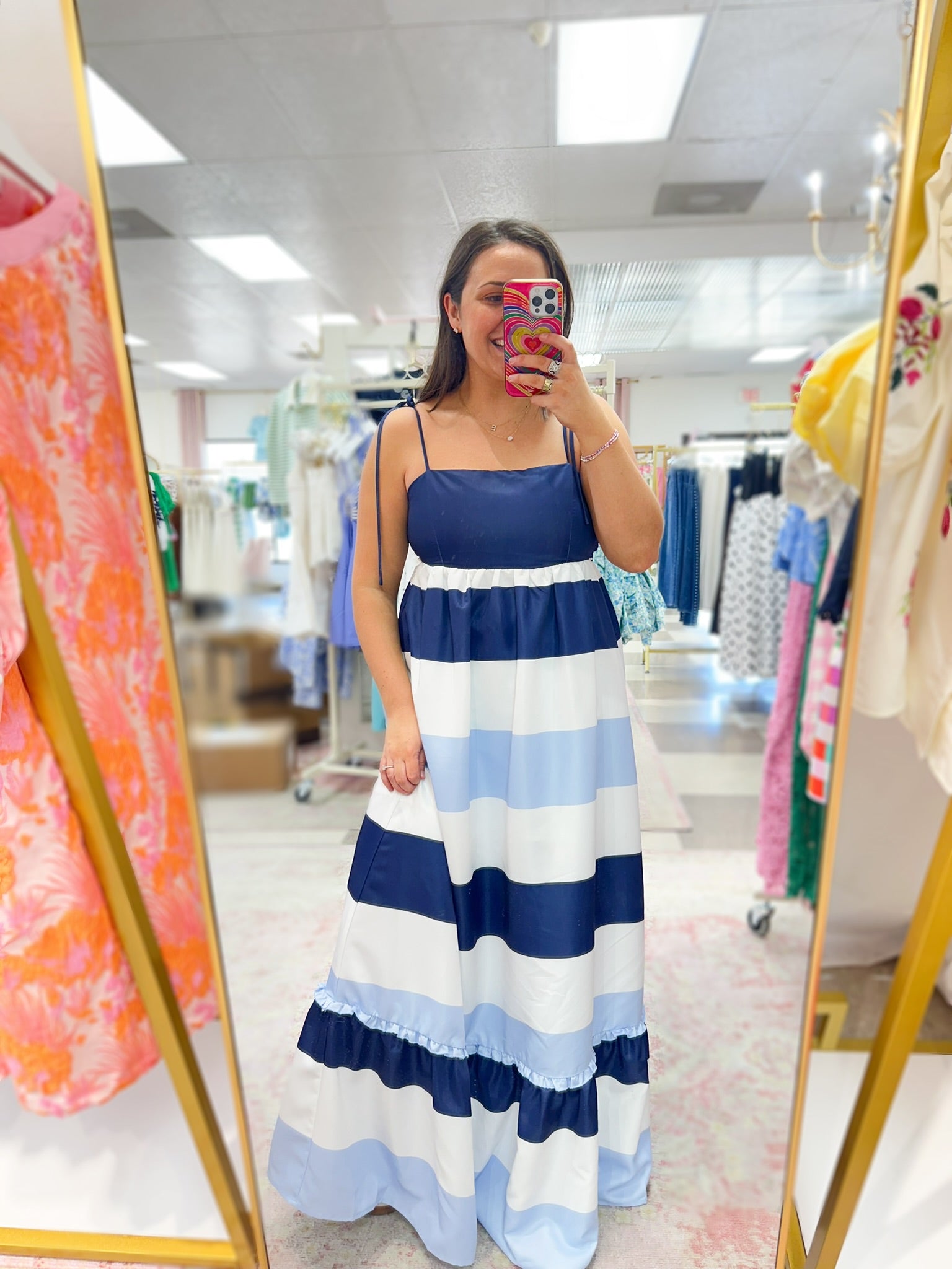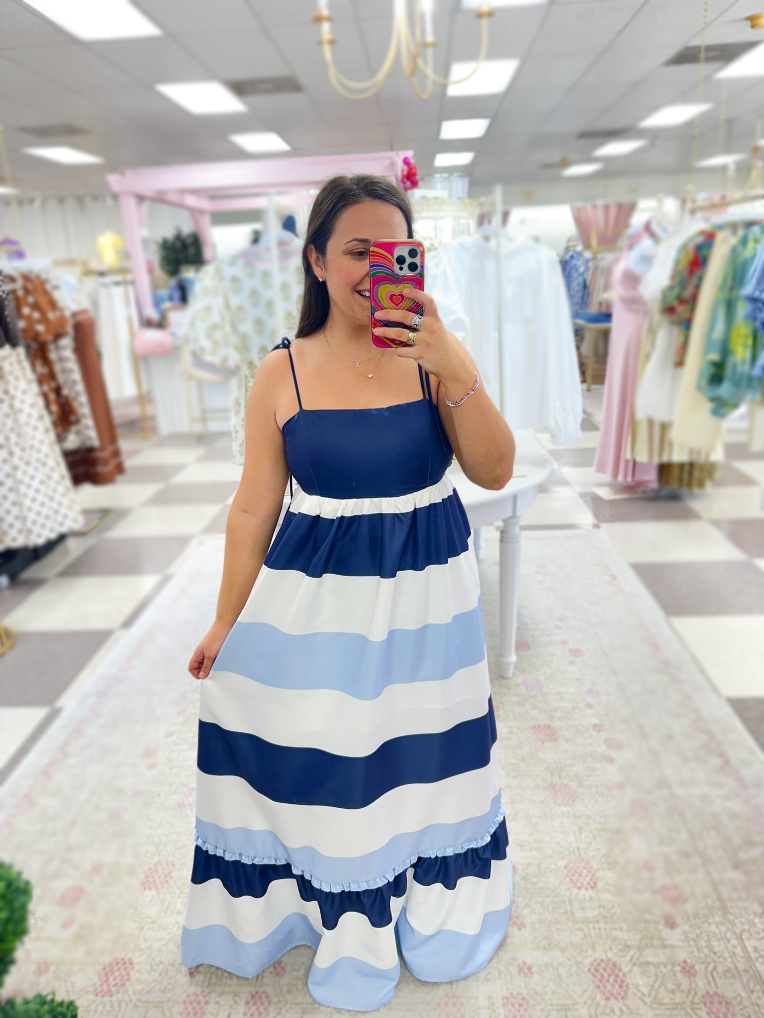 Classic stripes meet effortless elegance in this breezy midi dress designed for sunny days and relaxed evenings. Featuring a flattering square neckline and adjustable tie straps, this dress flows into a softly tiered skirt that moves beautifully with every step. The smocked back offers a comfortable, flexible fit, while the fully lined interior ensures ease and coverage.
