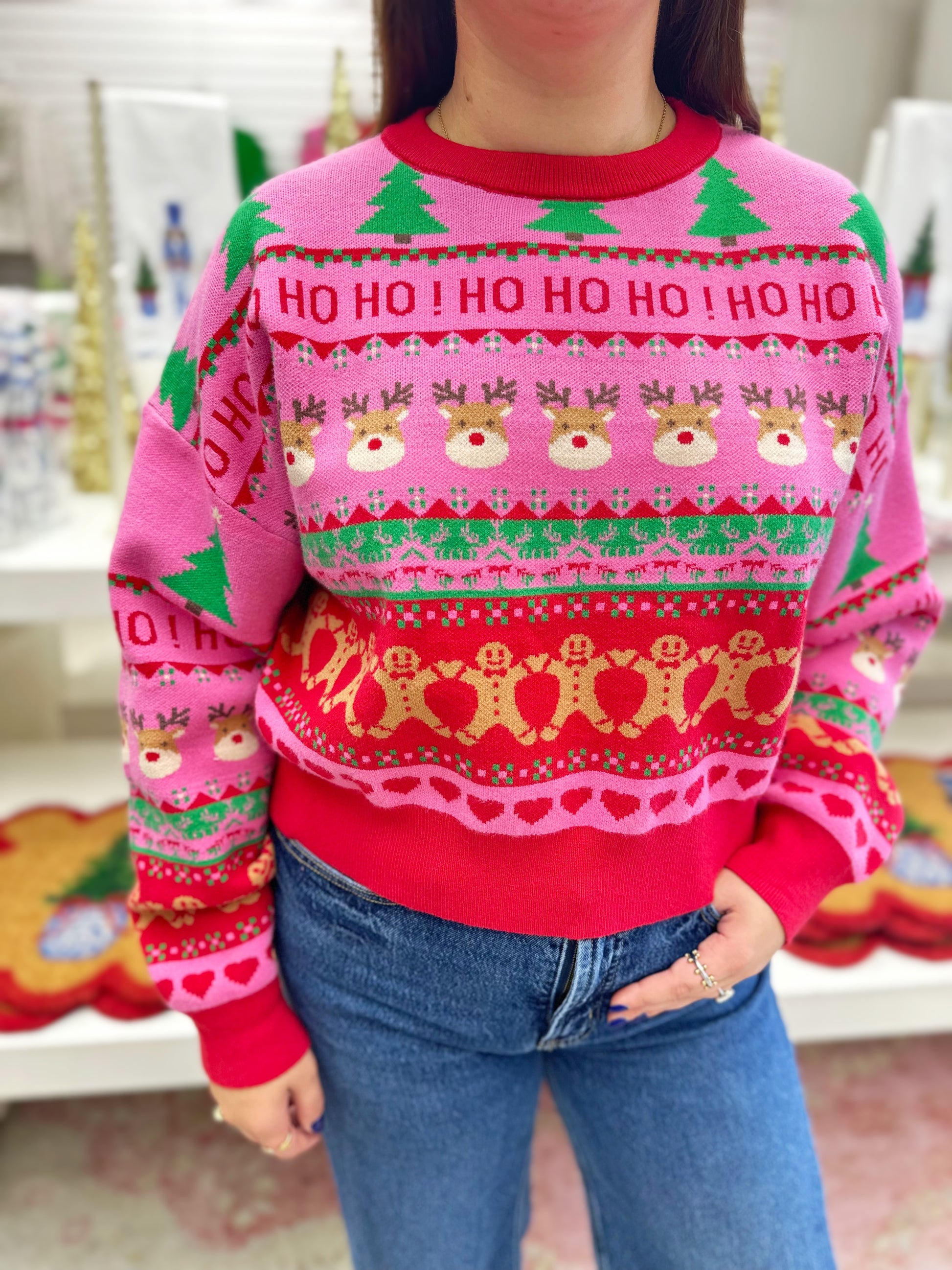 Bring the holiday cheer with our festive Christmas sweater! Featuring the cutest reindeer, gingerbread friends, and bright Christmas trees in cheerful pink and red hues, this cozy knit runs true to size — perfect and so fun for all your holiday festivities!
