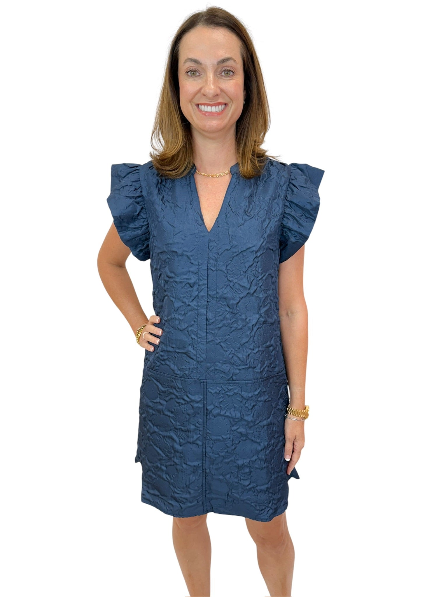 Effortless and chic, this textured dress features a flattering V-neckline and statement ruffle sleeves. Designed in an easy shift silhouette, it offers both comfort and style—perfect for work, weekends, or special occasions. Perfect to pair with boots or heels. Runs true to size
