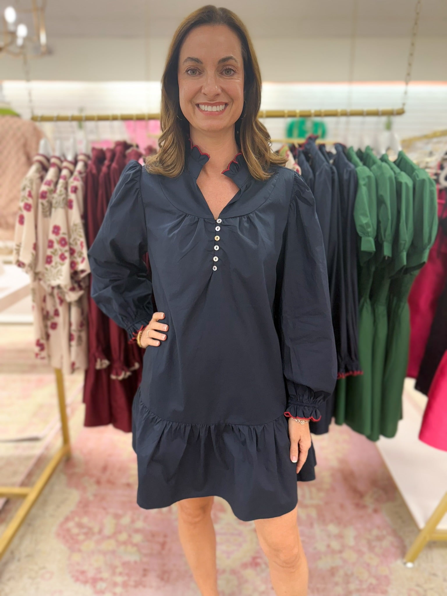 Effortlessly chic and endlessly versatile, this baby mini dress features a tiered silhouette with subtle gathering for a flattering fit. Designed with a stand ruffle collar, a half-button front with pearlized buttons, and long puff sleeves finished with smocked cuffs. The lightweight fabric makes it perfect for year-round wear—style it with sneakers for a casual day out or boots for a polished look. Runs true to size.