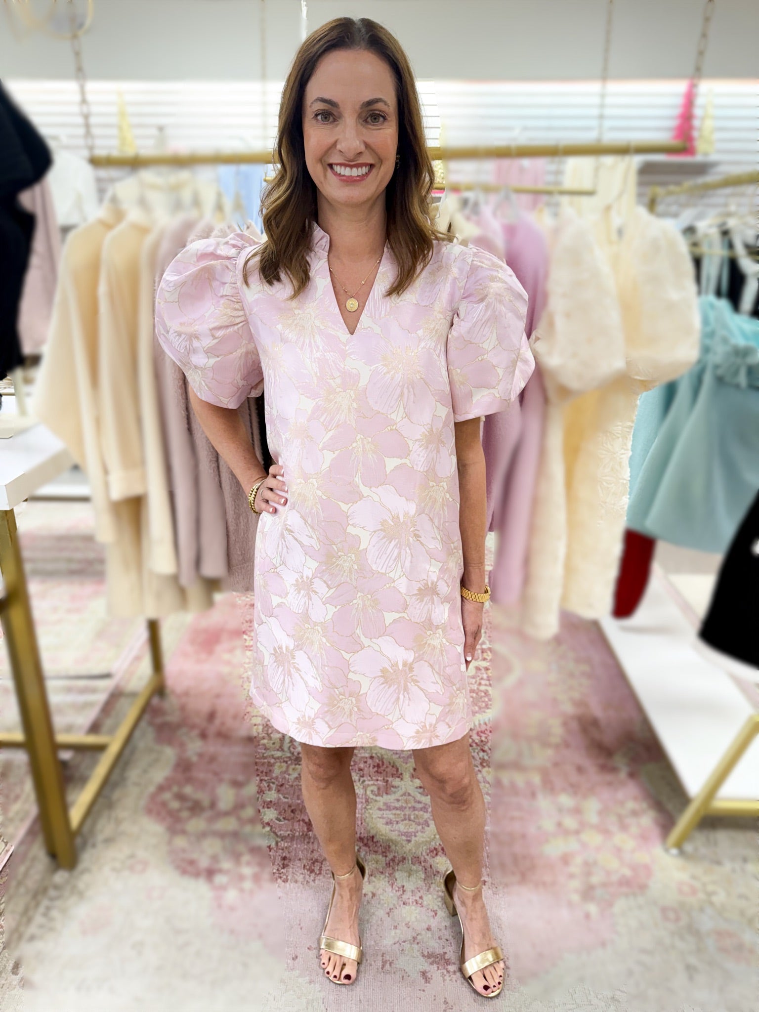 Pink Ruffle V-Neck Puff Sleeve Mini Dress