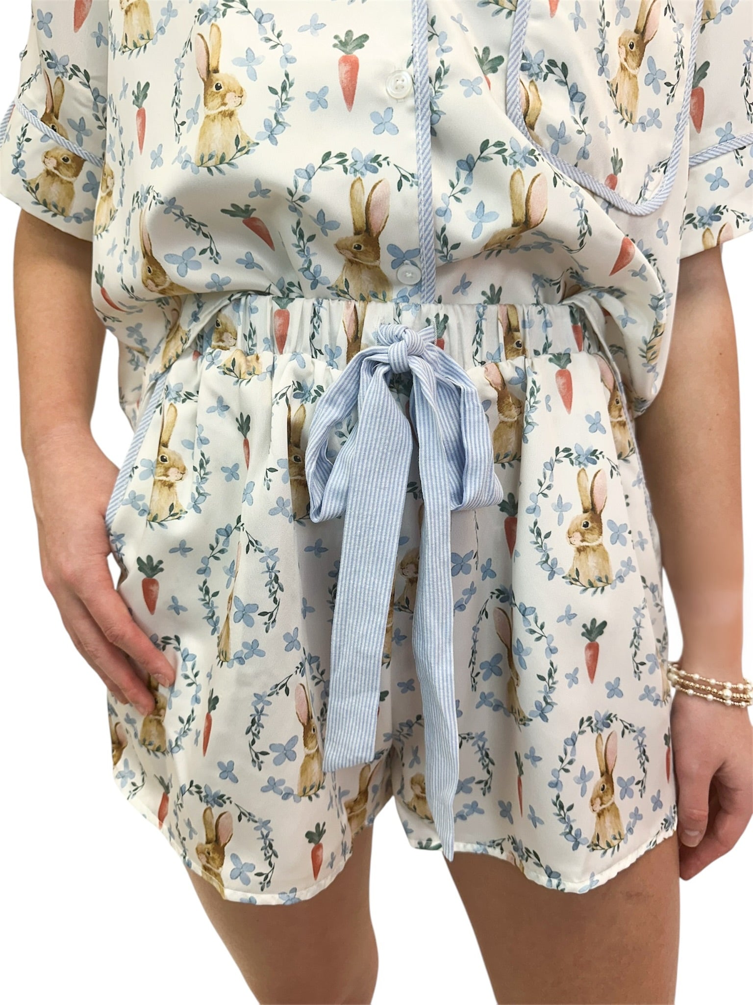 These satin bunny print pajamas are as soft as they are adorable! The top features a classic button-down style with a front pocket and short sleeves with tie details. The matching shorts have an adjustable drawstring waist for the perfect fit and a single back pocket for a cute finishing touch. Ideal for spring lounging or Easter morning!