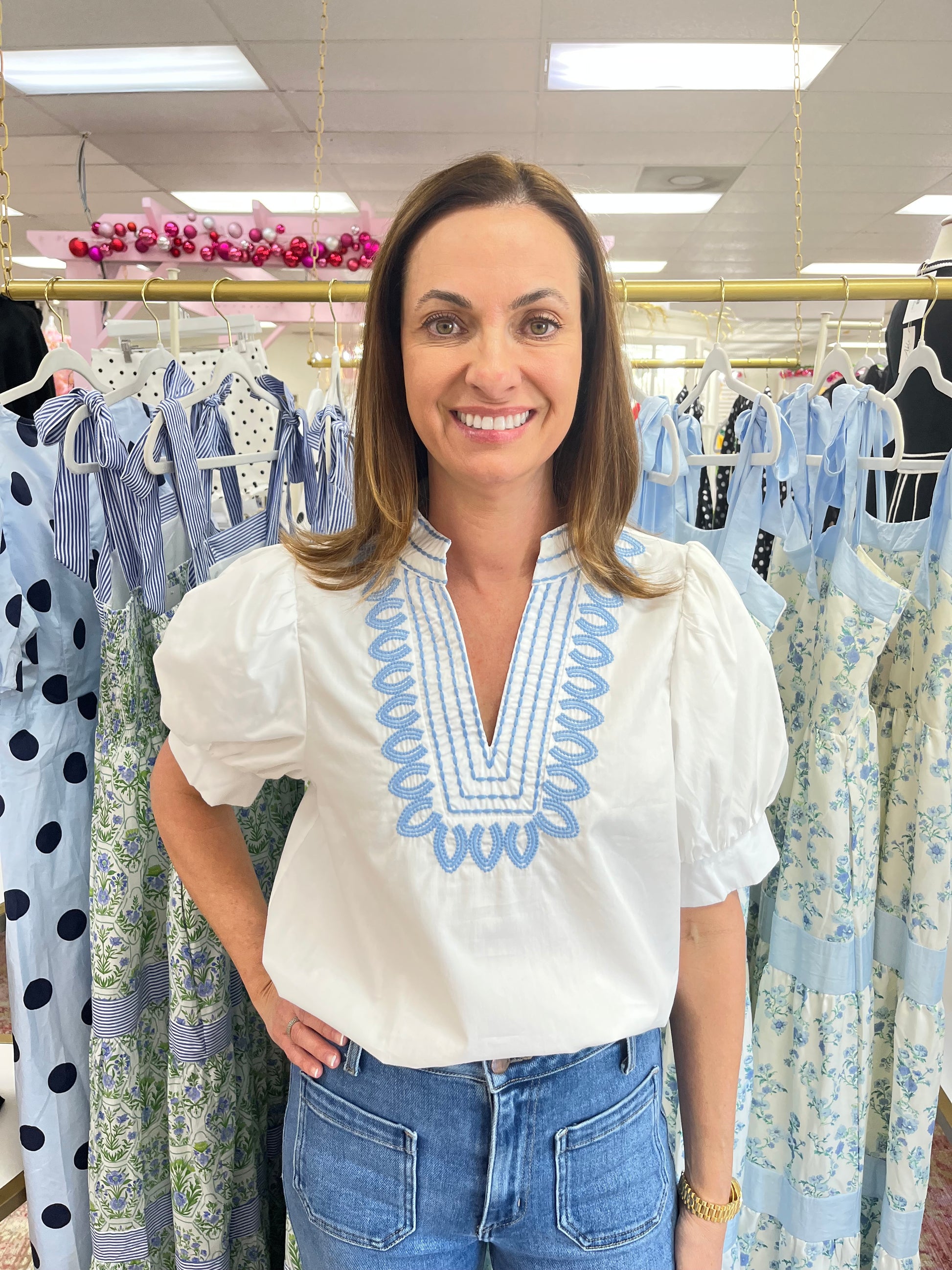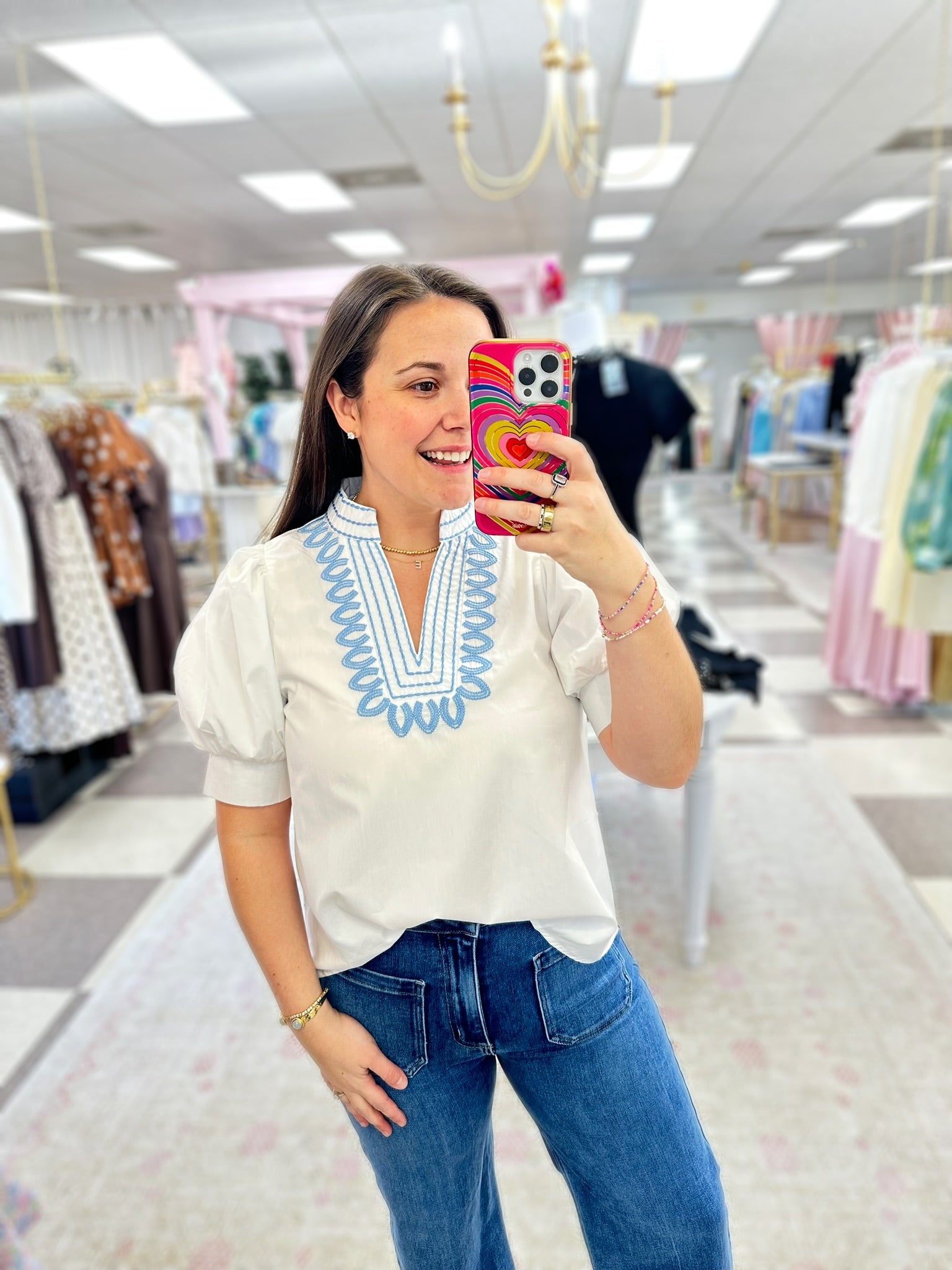 The White with Blue Trim V-Neck Embroidered Puff Sleeve Top is a chic and feminine addition to any wardrobe. Featuring a flattering V-neckline adorned with delicate white embroidered trim, this short-sleeve top also has banded puff sleeves for a soft, stylish silhouette. Lightweight and breathable, it’s perfect for layering or wearing on its own for a polished everyday look.