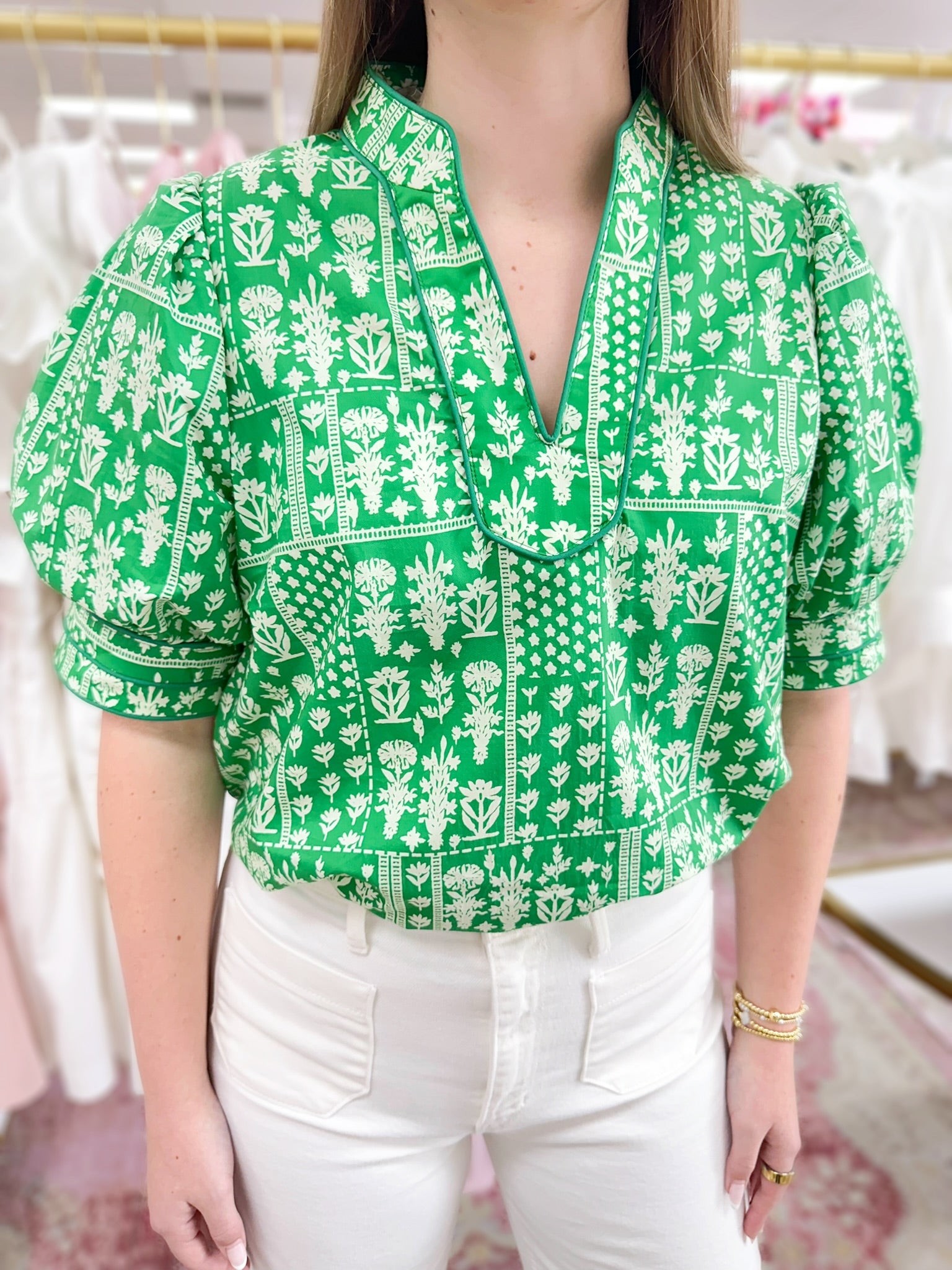 The Mahjong Puff Sleeve Top is a playful and feminine statement piece. Designed with short puff sleeves and a flattering V-neckline, this top features a vibrant green and white pattern that adds a bold pop of color to any outfit. Crafted from breathable cotton, it’s lightweight, comfortable, and perfect for everyday wear.