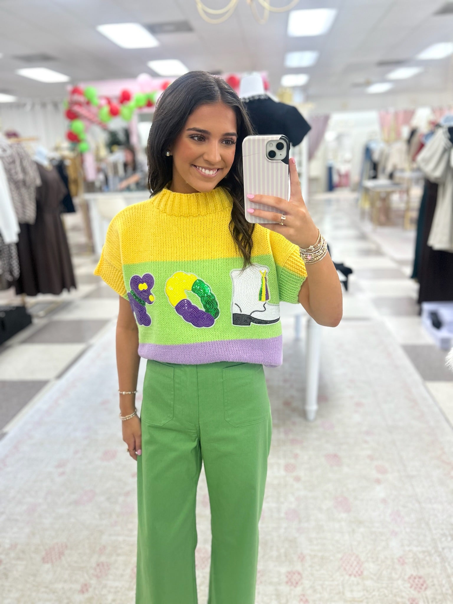 Bring the spirit of Carnival to life with this playful Mardi Gras sleeveless sweater. Featuring yellow, green, and purple color blocking, this standout top showcases festive appliqués across the center—a white Mardi Gras marching boot, a king cake, and an adorable bead dog for a fun, celebratory touch. The sleeveless silhouette makes it perfect for layering or wearing on its own during warmer parade days. Model 1 is wearing size medium & model 2 is wearing size small