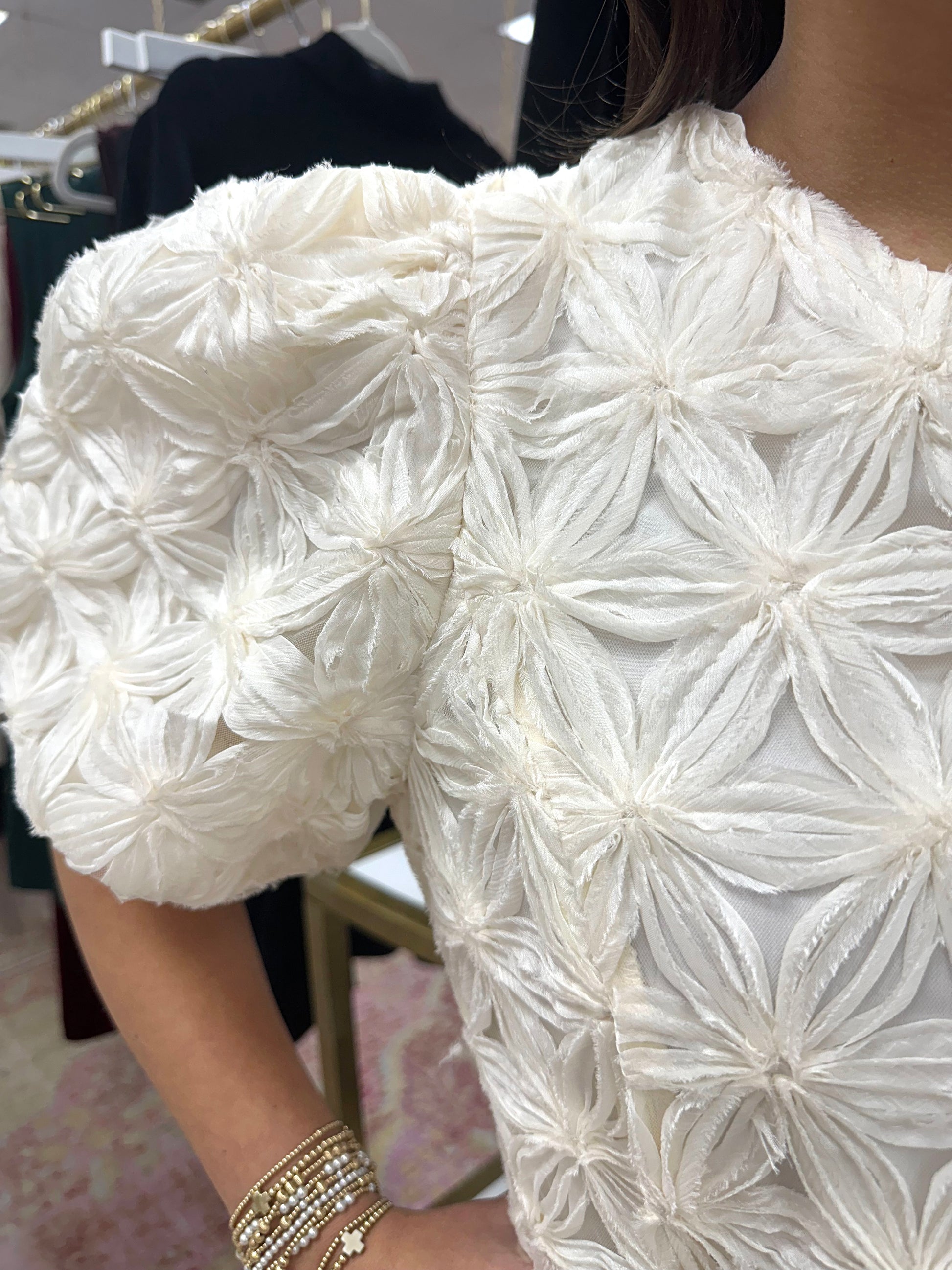 Beautiful cream mini dress featuring delicate appliqué detailing and soft puff sleeves. Finished with a hidden back zipper for a clean, seamless look. A feminine, standout piece perfect for special occasions.