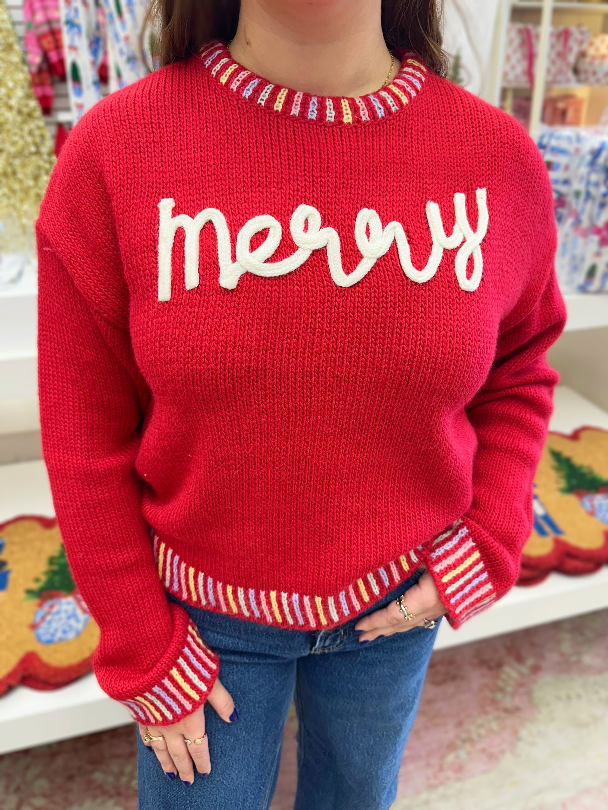 Get in the holiday spirit with our Merry & Bright Sweater — a cozy red knit with festive flair. The cheerful “merry” lettering adds a playful touch, while the striped trim along the neckline, cuffs, and hem gives it that extra pop of Christmas charm. Soft, warm, and easy to style with jeans or leggings for a festive look all season long.