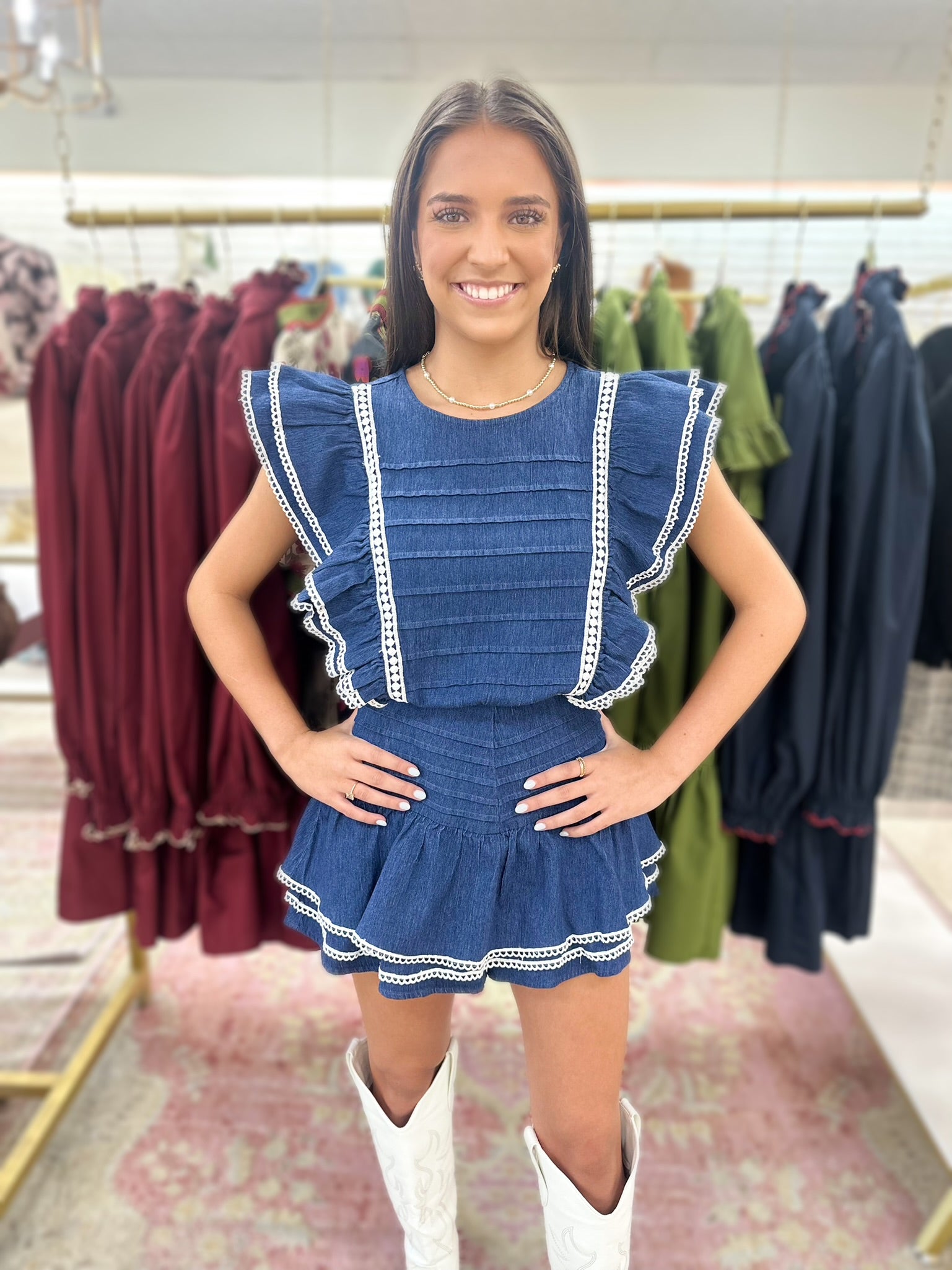A denim set featuring ruffled sleeves, pintuck detailing, and lace trim accents. Finished with a fitted waist and flouncy hem for a flattering look. Runs true to size. Model is wearing size small