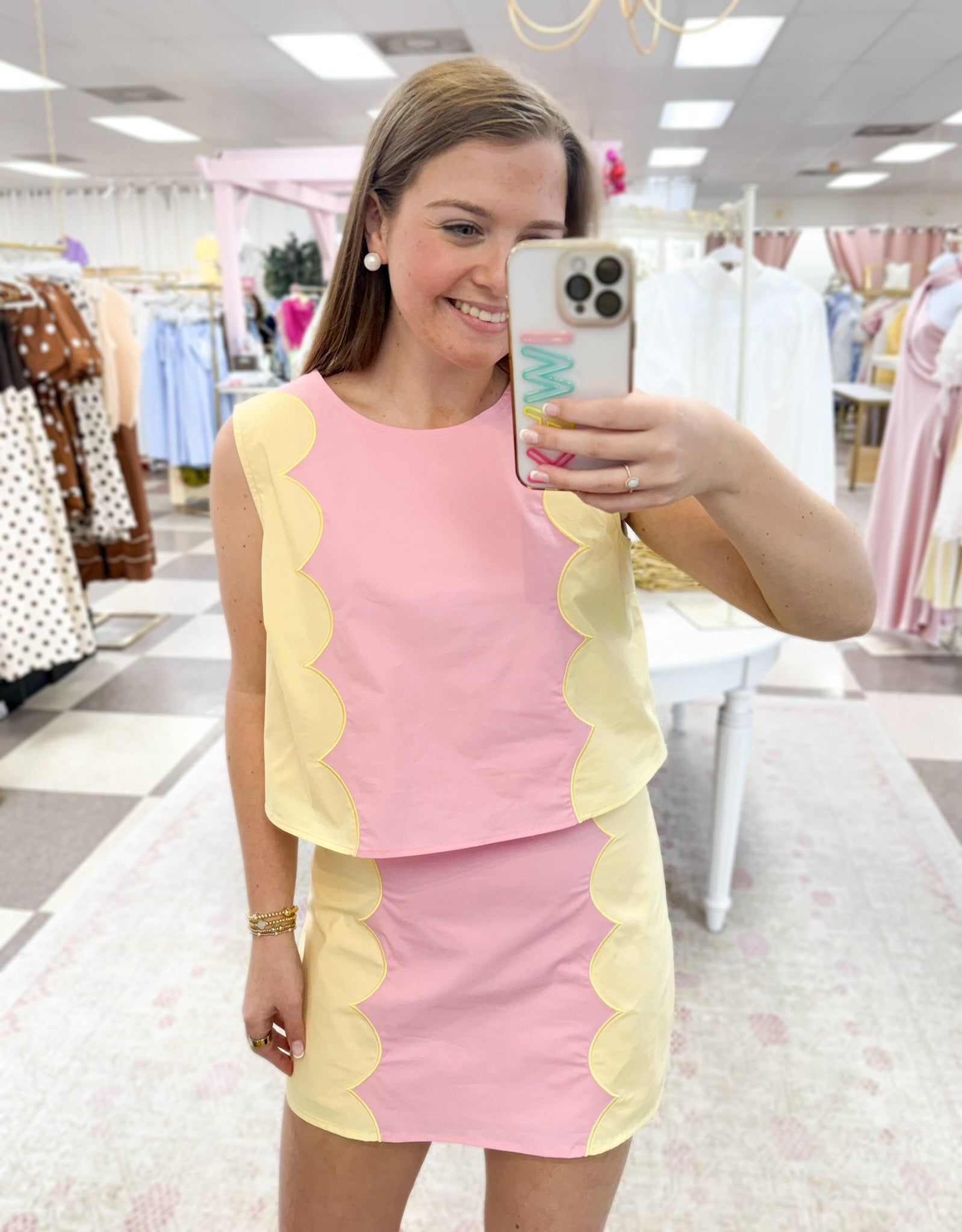 Effortless and chic, this matching set is your go to style for easy but put together style. Lightweight flattering comfortable fit, pink with yellow stitched scallop design on sides of top and skirt. top and bottom or fully lined.