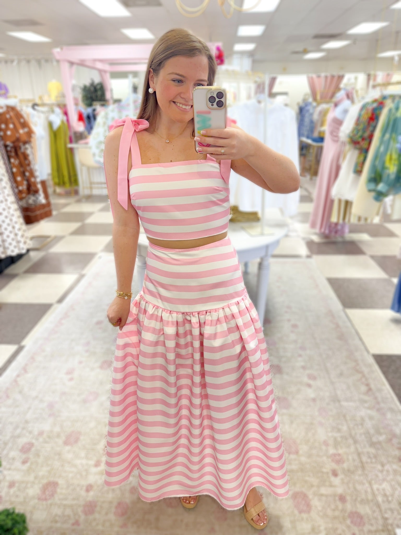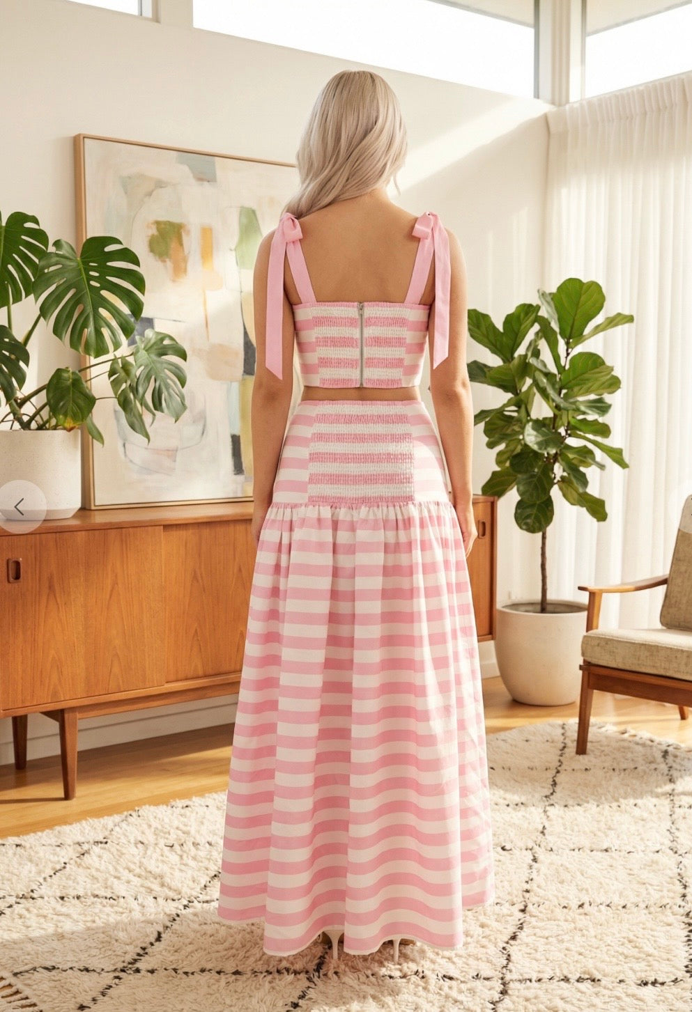 Sweet, stylish, and effortlessly flattering, this pink striped two-piece set is the perfect blend of playful charm and everyday elegance. Featuring a cropped top with adjustable tie shoulders and a coordinating high-waist maxi skirt, this set creates an easy, put-together look with minimal effort. The softly gathered skirt adds graceful movement, while the striped pattern keeps it timeless and fresh.