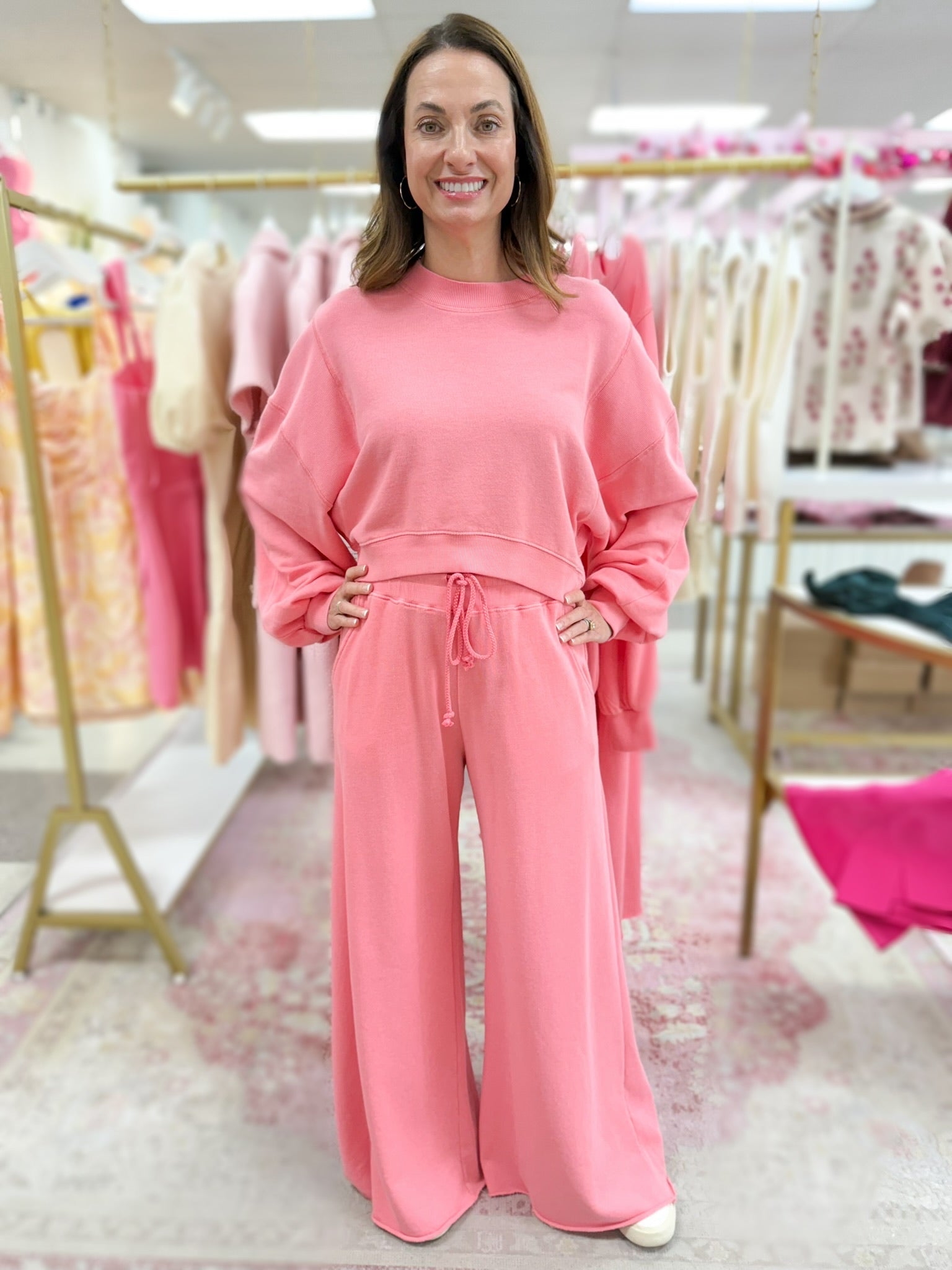 Cozy meets chic in this coral lounge set. Featuring a relaxed crewneck pullover with drop shoulders and wide-leg drawstring pants, this set is perfect for travel days, lounging, or casual errands. Soft, lightweight fabric keeps you comfy while the flattering silhouette keeps you stylish. Runs true to size.