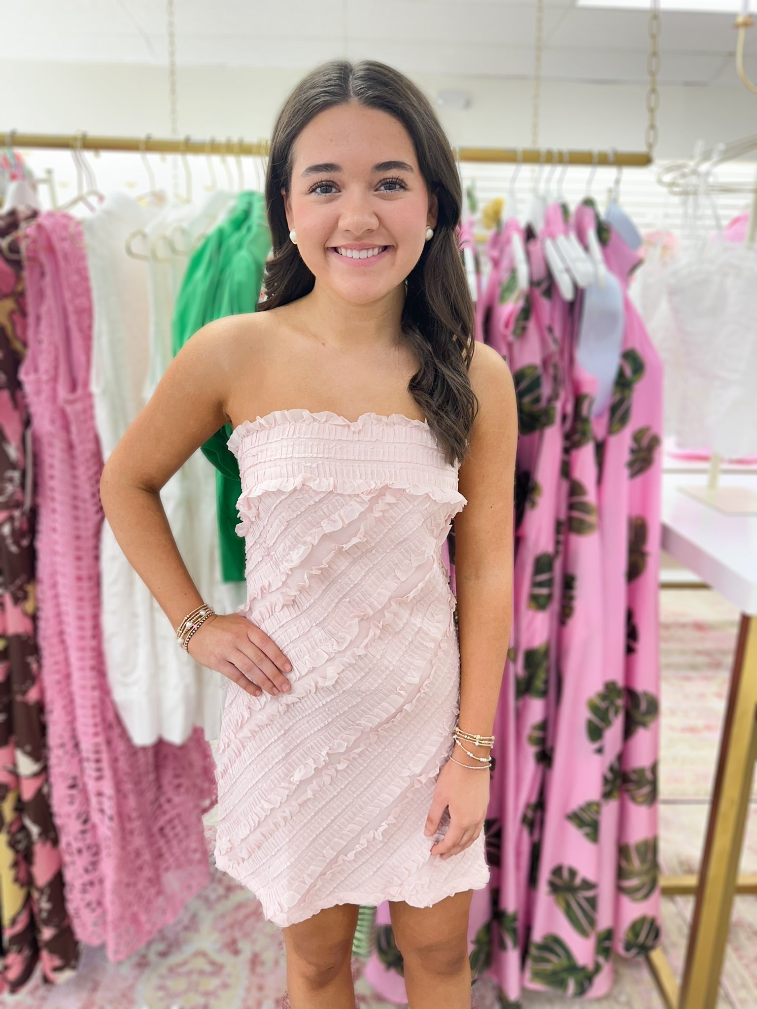 Soft, romantic, and irresistibly feminine, this blush pink ruffle dress is made to turn heads. Designed with delicate layered ruffles and subtle ruching throughout, it hugs the body in all the right places while keeping a light, airy feel. Adjustable spaghetti straps and a softly draped neckline add to its flirty charm, making it perfect for date nights, bridal events, or any occasion that calls for something special.
