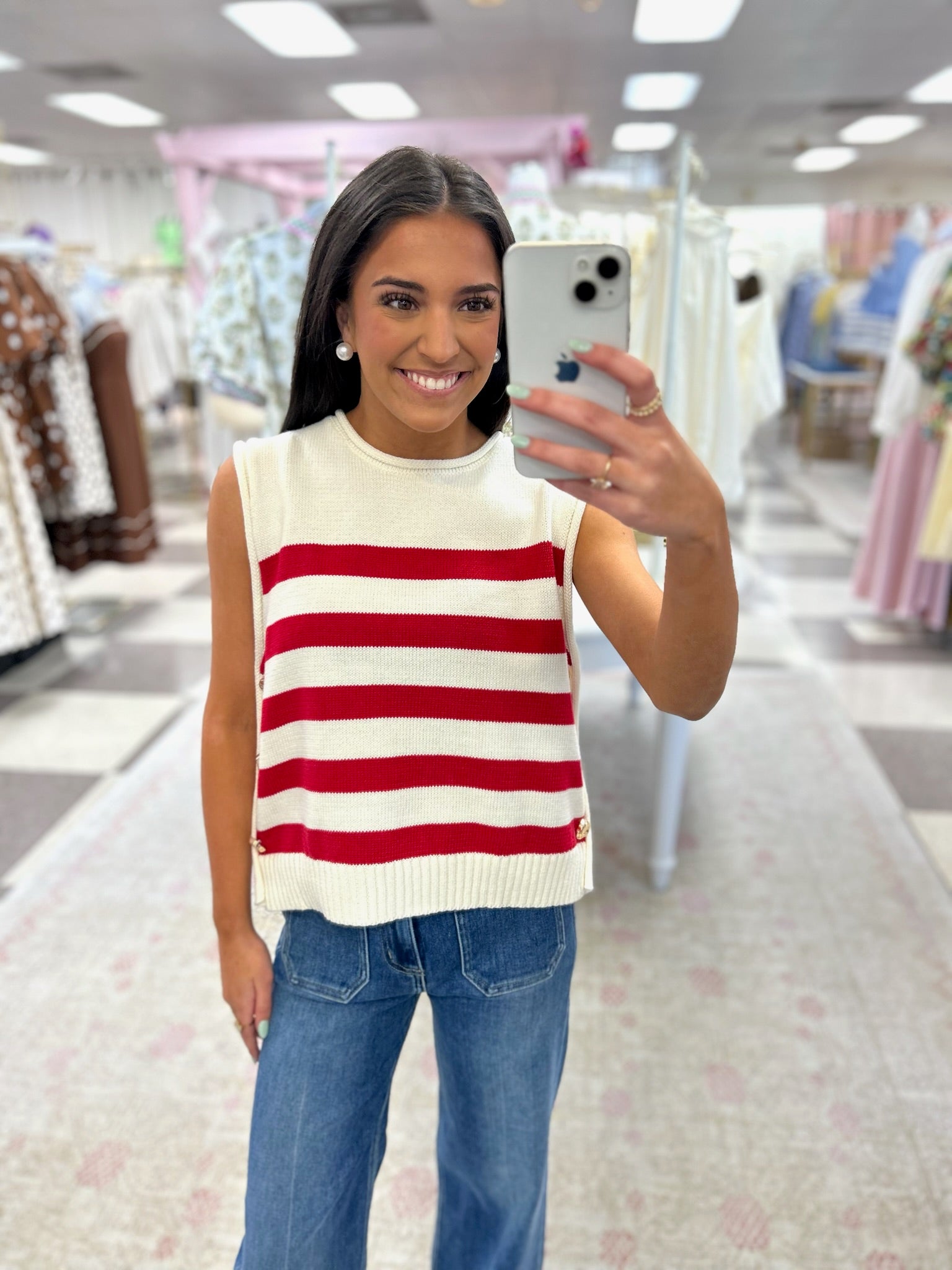 Classic with a chic twist, this sleeveless sweater top features timeless white and navy stripes accented by elegant gold buttons along the side. Crafted from a soft, comfortable knit, it’s perfect for layering or wearing on its own for a look that transitions effortlessly from day to night.