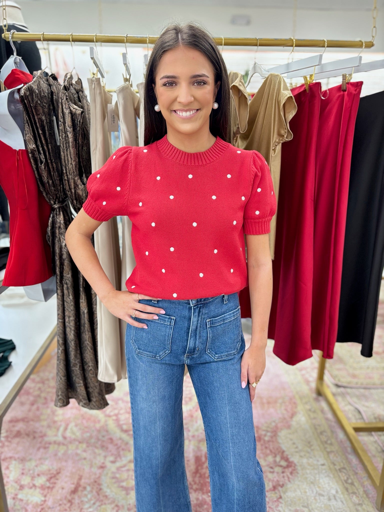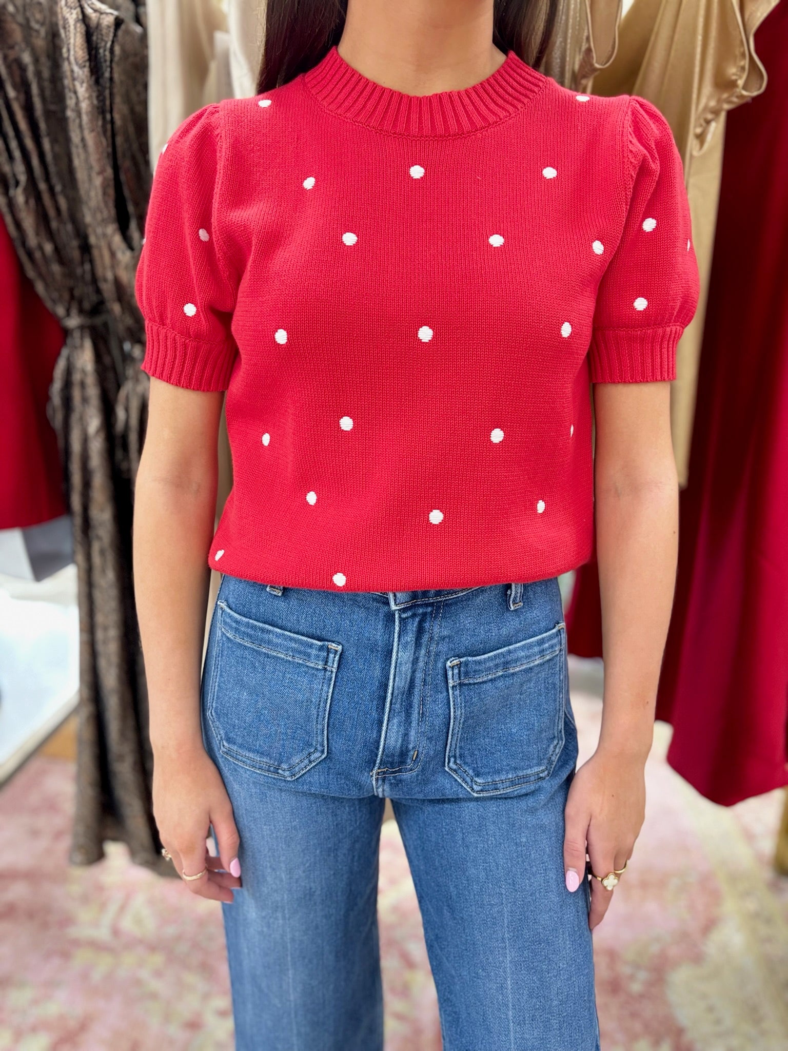 This red lightweight short sleeve sweater features crisp white polka dots for a fresh, cheerful look. Designed with a classic round neckline and an easy, breathable feel, it’s the perfect piece for warm days or transitional layering. Effortlessly versatile, this sweater pairs beautifully with denim or skirts for an everyday look that feels both comfortable and put-together.