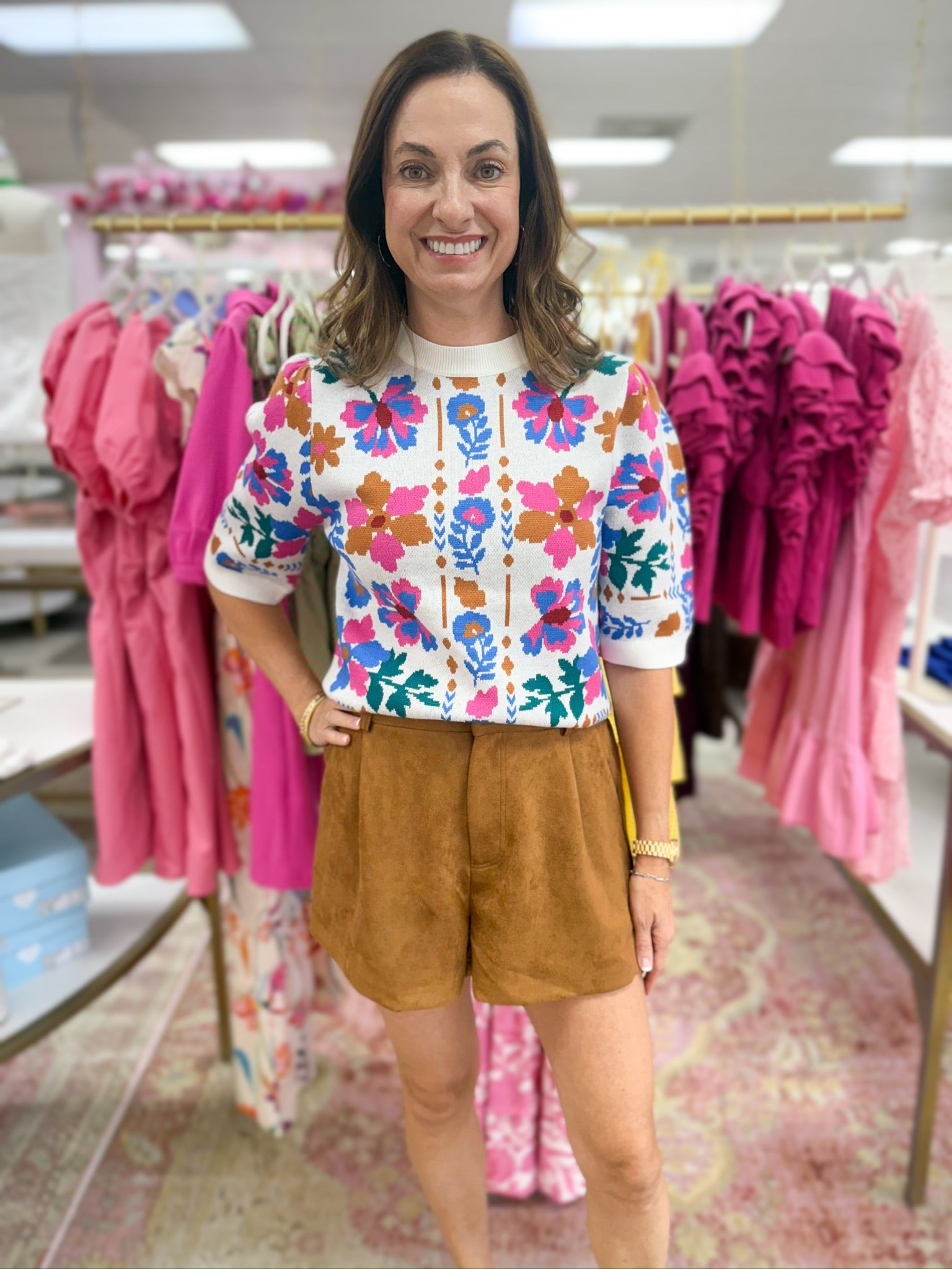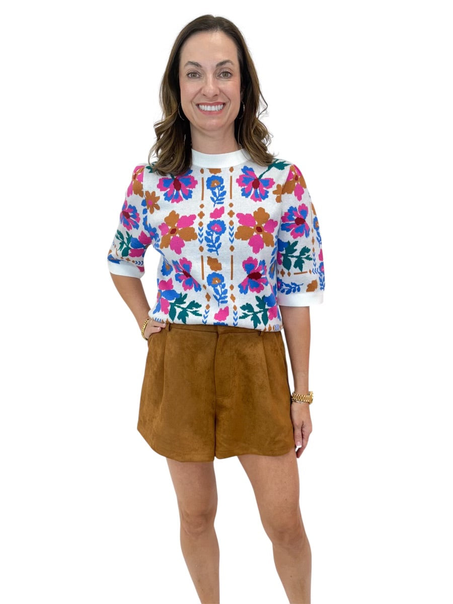 The Teri Sweater is crafted from a medium weight sweater fabric with a colorful floral print that stands out on a cream base. Featuring a classic crew neckline and half sleeves, this easy-to-wear style brings a fun, fresh look that pairs perfectly with shorts, denim, or skirts. Runs true to size.