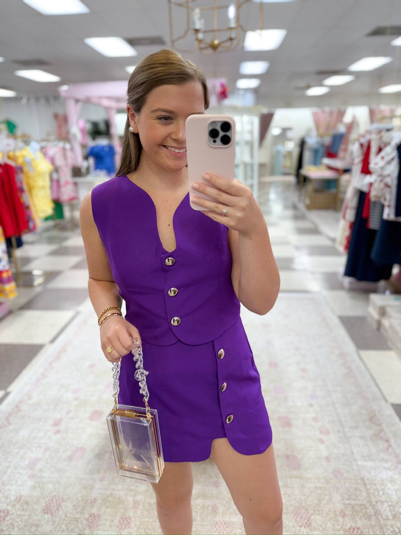 This bold purple set features a sleeveless structured top and matching mini skirt with sleek silver button detailing. The asymmetrical skirt adds a chic edge, while the tailored fit makes it perfect for game day or a night out.