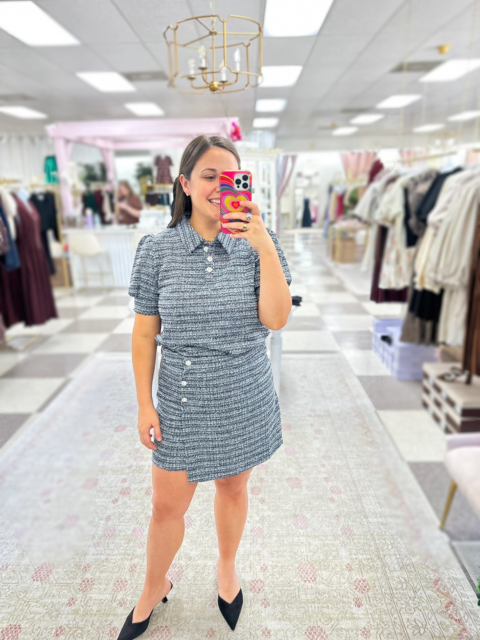 Classic and chic, this tweed set features a short-sleeve collared top with jeweled buttons and a matching asymmetrical skirt with side button detail. The textured tweed fabric blends shades of navy, black, and white and has just the right amount of stretch for a comfortable, flattering fit. Perfect for work, brunch, or holiday events. Model is wearing size large. Hidden back zipper on skort. Sold as a set