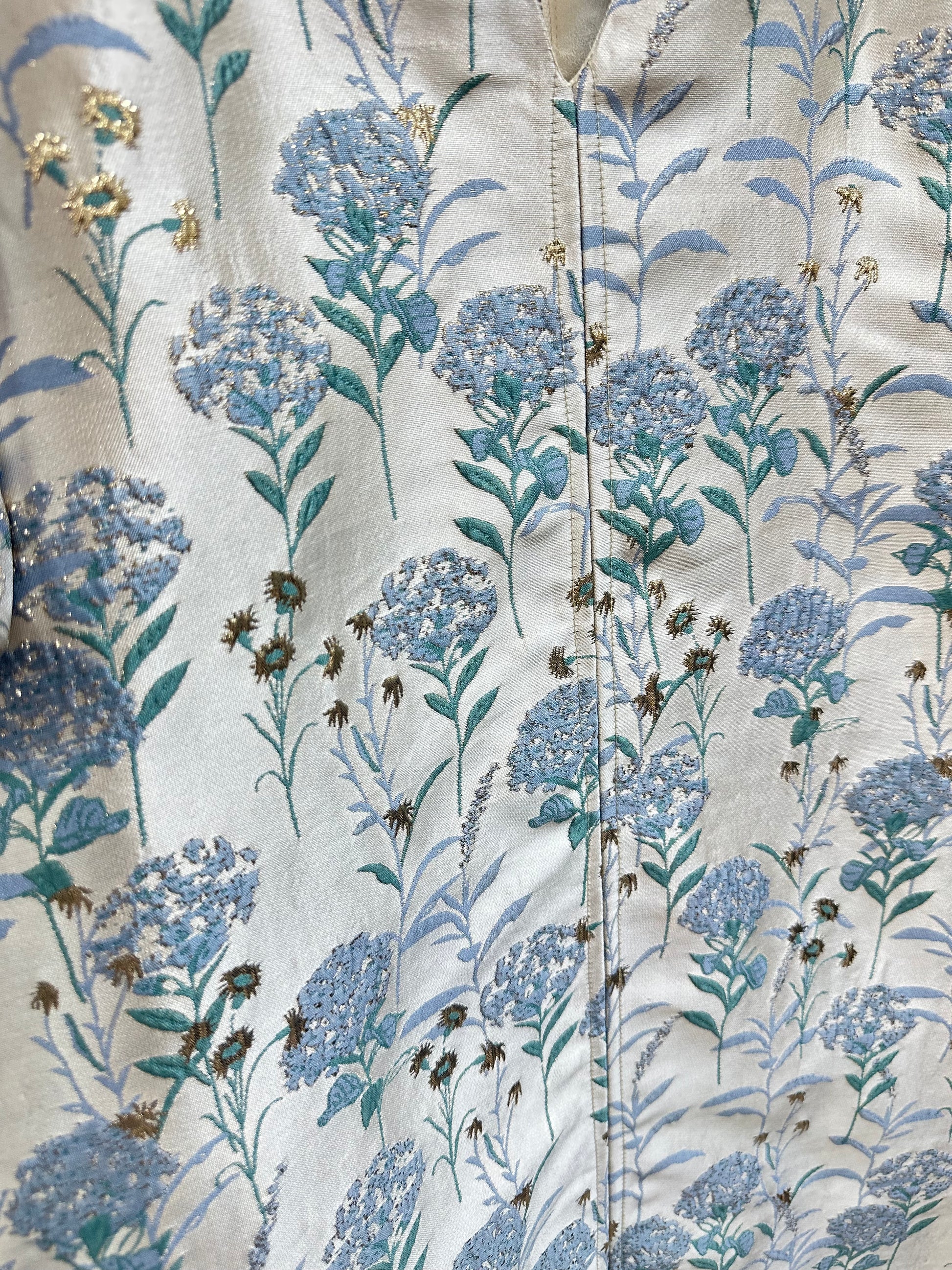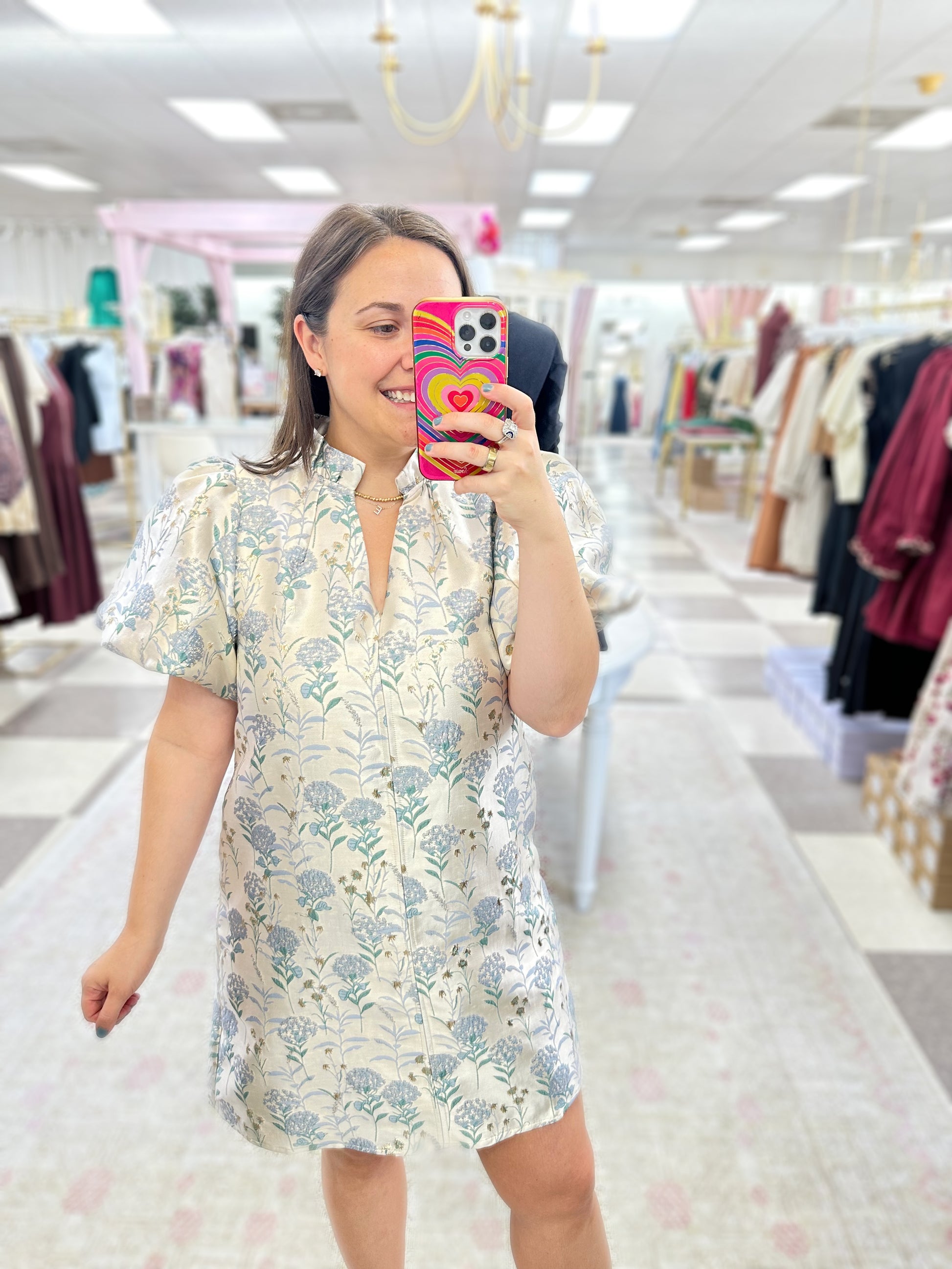 This floral jacquard dress features a structured fit with statement puff sleeves and a flattering straight silhouette. Designed with a visible silver zipper down the first half of the back for an elevated touch and subtle shimmer woven through the soft blue and green floral embroidery. Fully lined with hidden side pockets. Runs true to size. Model is wearing size medium. Perfect for your next event or for family pictures!