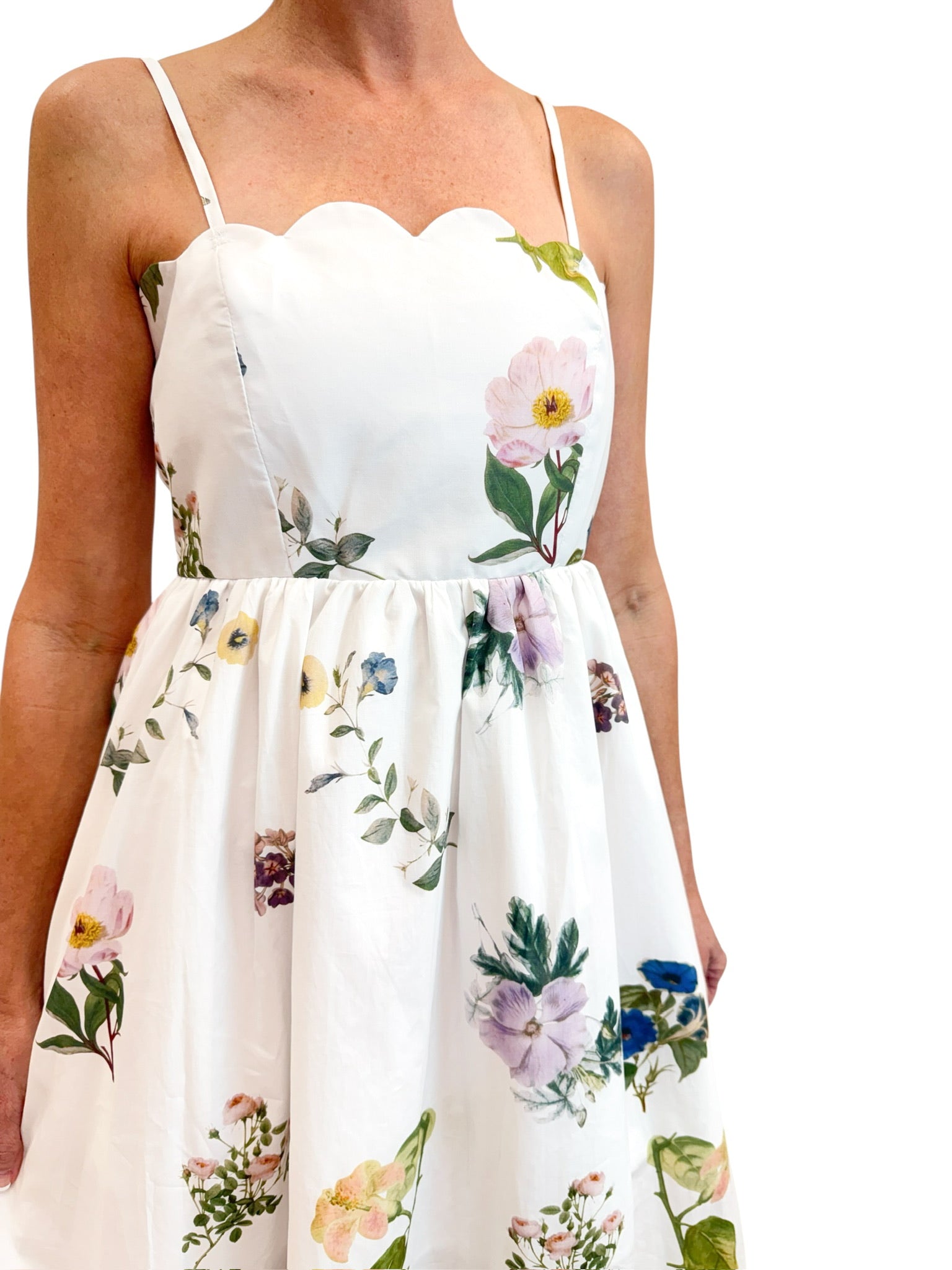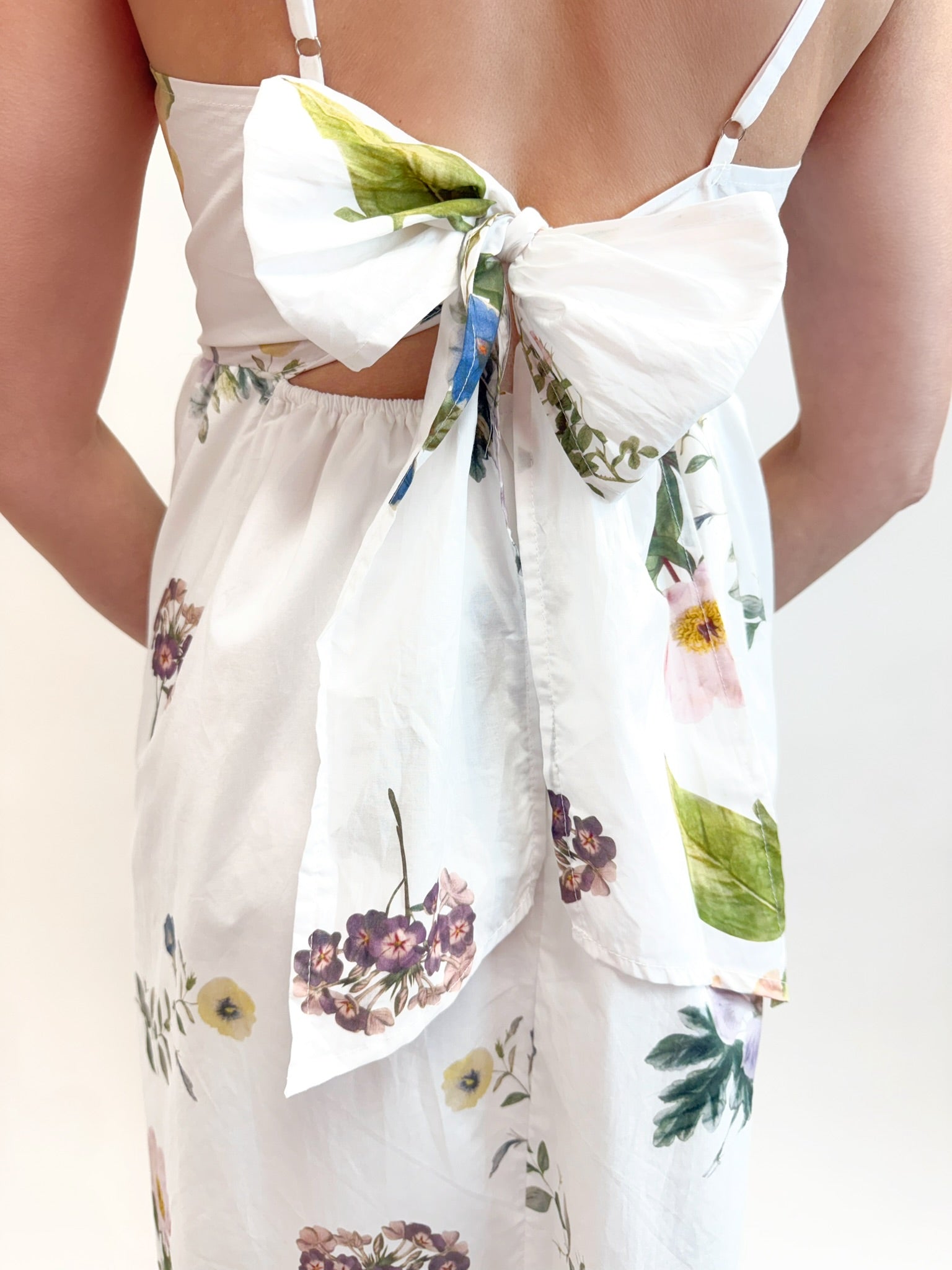 The Whimsical White Floral Maxi Dress is a dreamy and feminine piece perfect for warm-weather occasions. Featuring a soft white base adorned with scattered floral stems, this dress showcases adjustable tie straps, a flattering scalloped bottom hem, and a fully lined design for comfortable wear. Lightweight and breathable, it flows beautifully for an effortlessly elegant look.